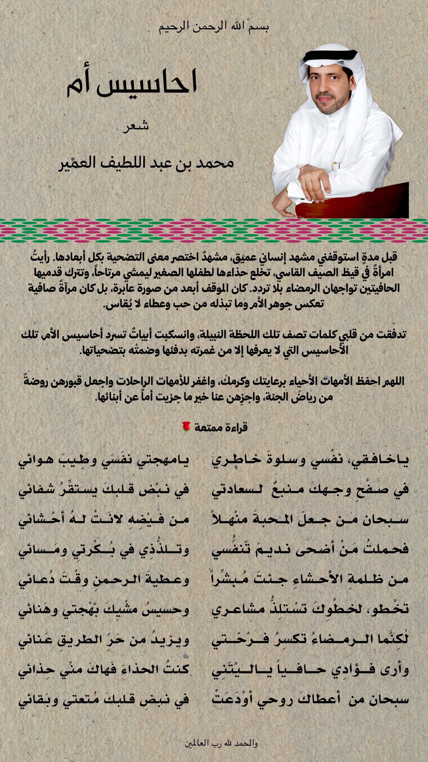 المهندس محمد العمير (أبو ياسر) لا تفوته لحظة فرح ولا تغيب عنه ومضة معاناة، ولا حتى مقال عابر ينشر، إلا ويبلغ صداه قلبه. وأنا، مع قلب أبي ياسر، أستمع لنبضه وأدرك صدقه، وقد شرّف مدونتي بفيض حسّه المرهف، ذلك الحس الذي لا يحتاج إلى تدقيق أو تمحيص.