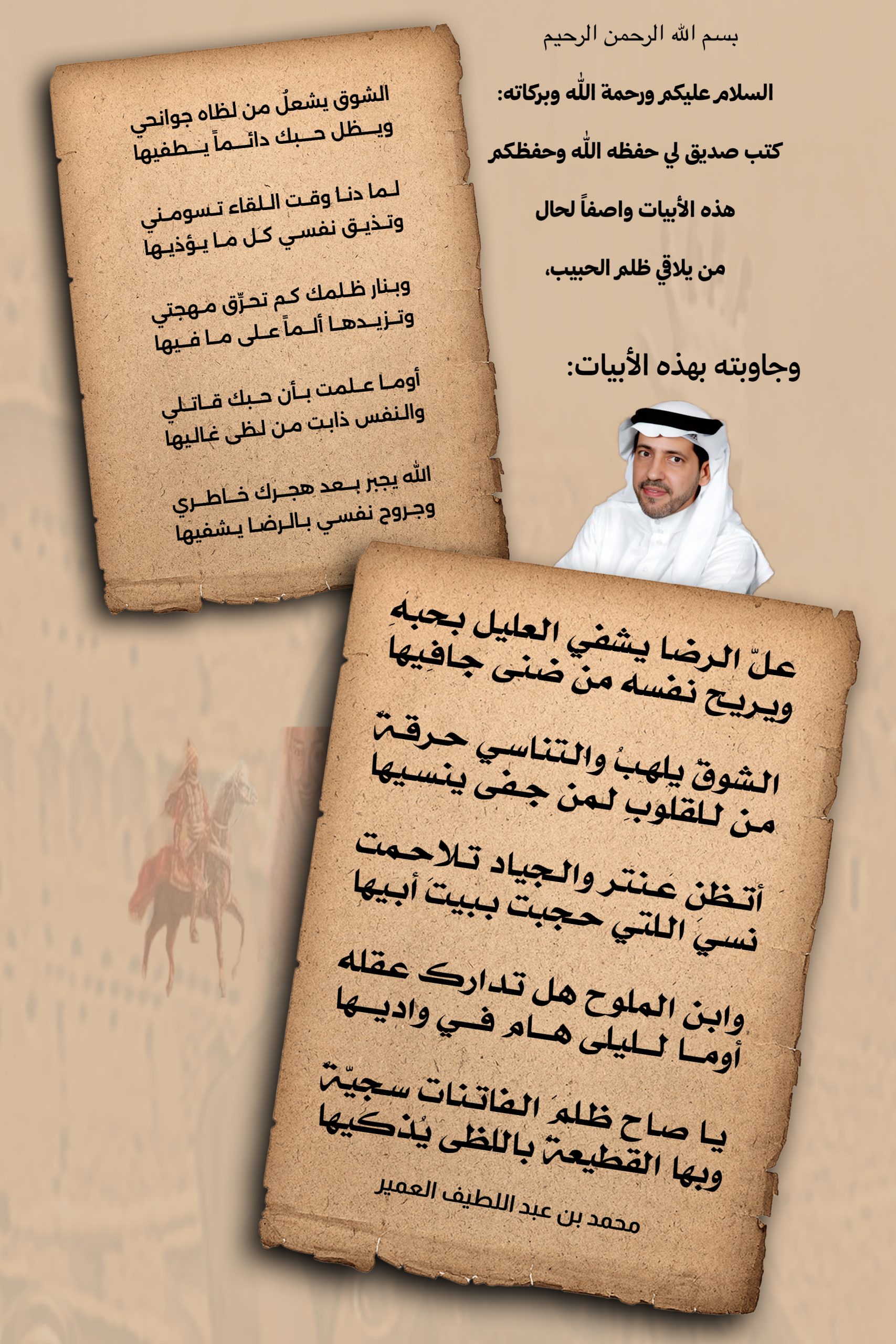 وهذا هو شاعرنا المهندس محمد العمير، يمتطي خيله برفقة قيسٍ وعنترة، ويخيم في وادي الشعر ردّاً على صديقه الذي اشتكى من الغرام وظلم الحبيبة.