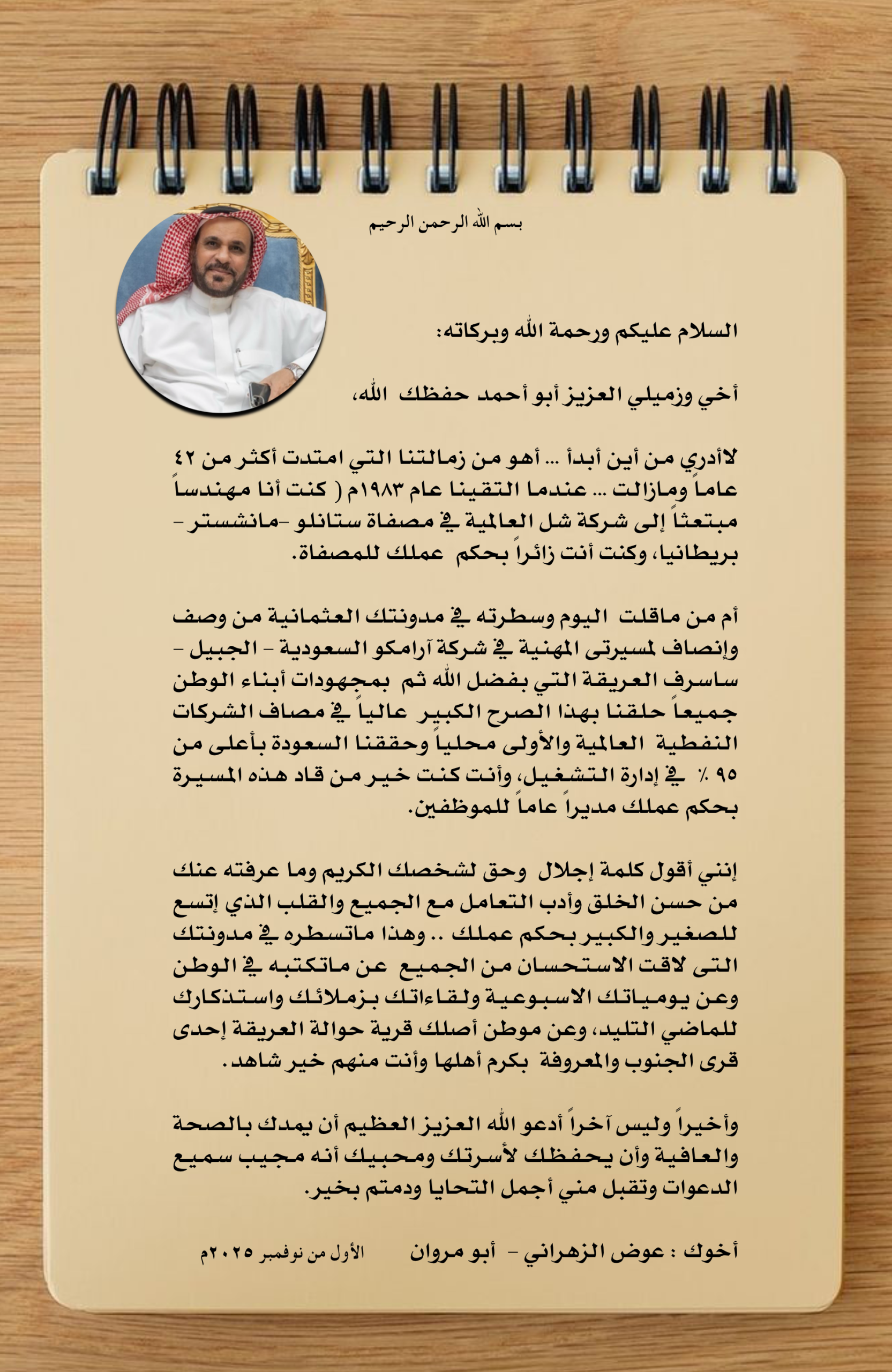 في زحمة الأيام وتقلّب السنين، تبقى بعض العلاقات المهنية شاهدة على قيمٍ لا تَشيخ، ومواقفَ تُخلّد الوفاء والأصالة بين الزملاء. ومن بين هذه المواقف الجميلة، وصلتني رسالة من الأخ العزيز المهندس عوض الزهراني (أبو مروان)، حملت في طيّاتها صدق المشاعر ونُبل المعاني، فكانت انعكاسًا صادقًا لما ربطنا من مودةٍ واحترامٍ طوال مسيرة العمل المشتركة.